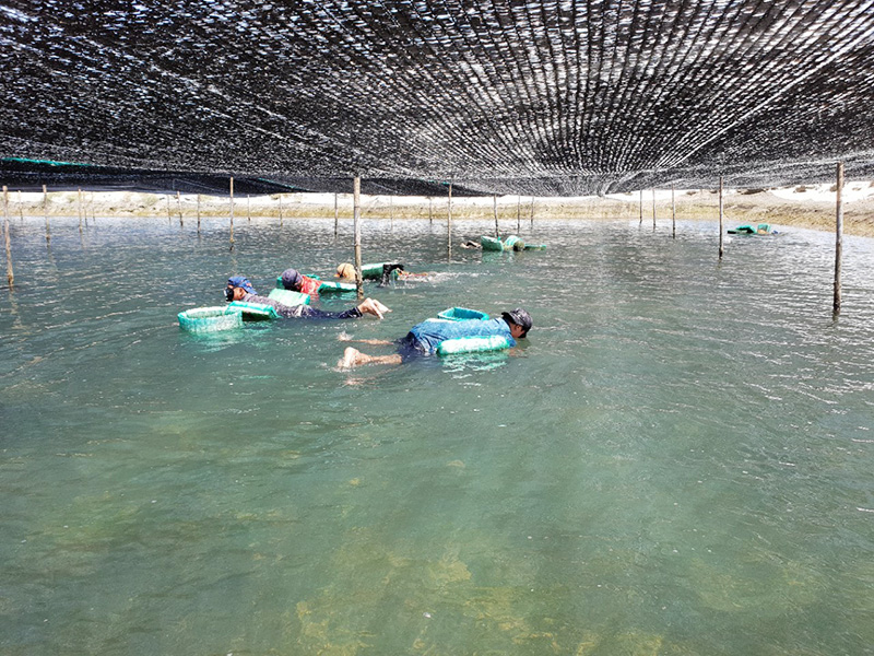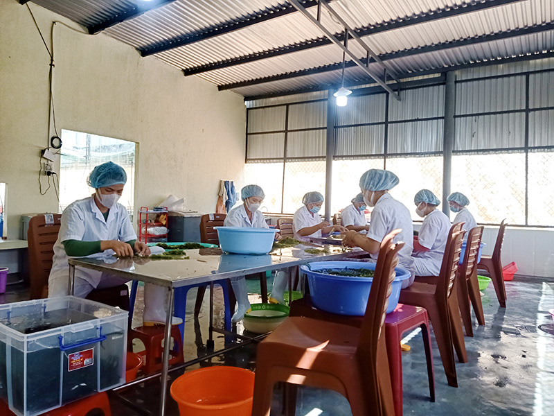 Đầu tiên, rong nho được thu hoạch từ hệ thống ao nuôi của chúng tôi và được loại bỏ bùn đất và rác trong thùng chứa nước.